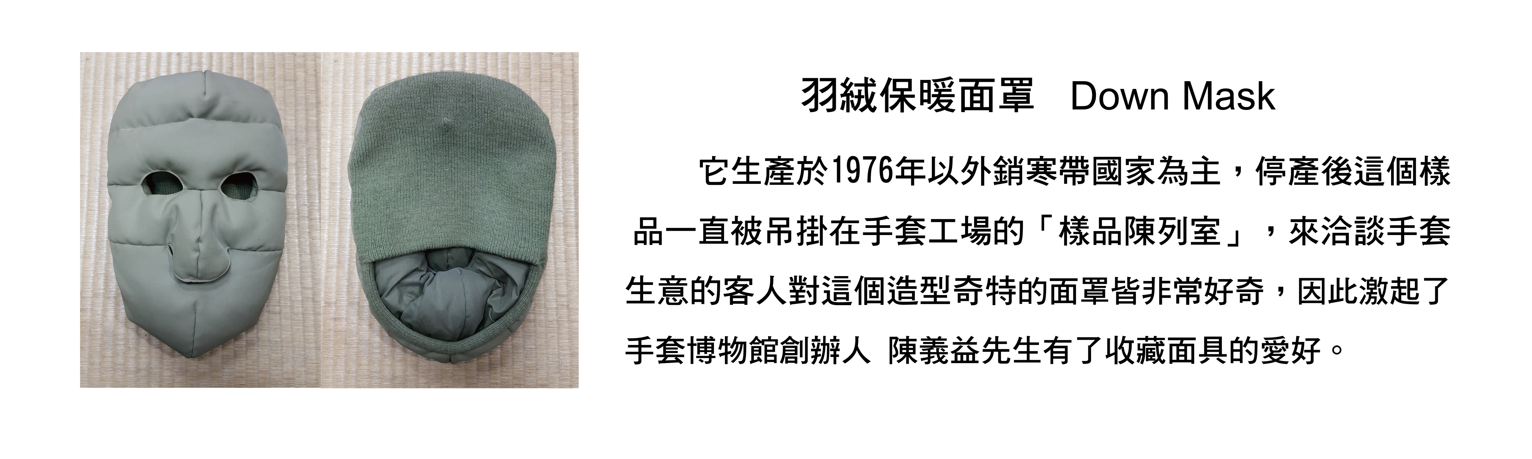 ●這個羽絨面罩及收藏的面具珍品將展示於台灣手套博物館中。