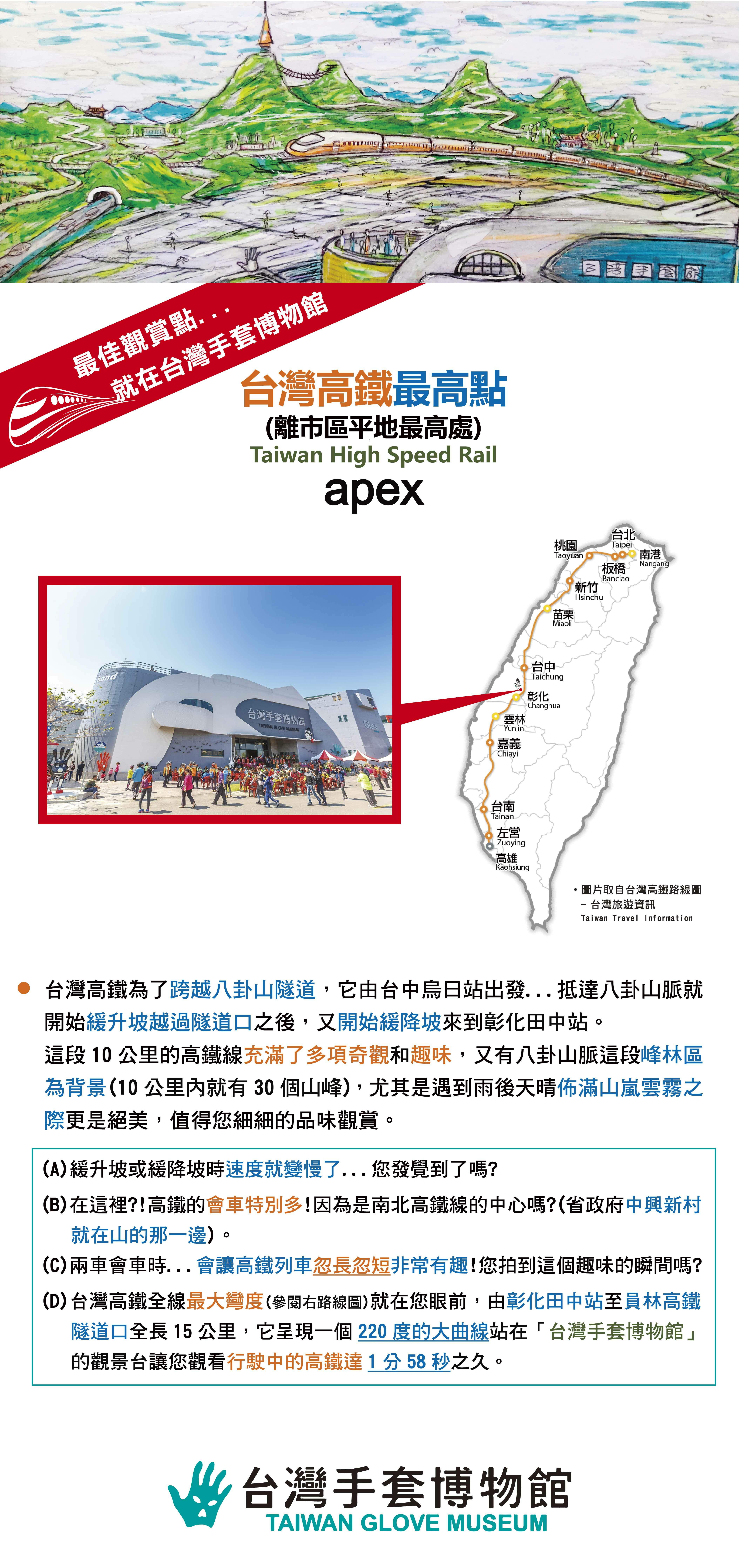 (C) 台灣手套博物館基地,位於彰化縣員林鎮與社頭鄉交會處的八卦山脈下,在頂樓的景觀台可觀賞長達15公里且呈現220度曲線的高鐵奔馳軌道,又可遙望著名景點"天空之橋"及"猴探井"山谷的另一個面向,園區周邊則是著名社頭芭樂的產區,四季的田園風光幽雅可人。台灣手套博物館緊臨社頭襪子產區、工廠、批發商林立,參觀手套博物館之餘,又可順道造訪採購正統MIT系列的產品。是一個值得您全家一遊的好地方。